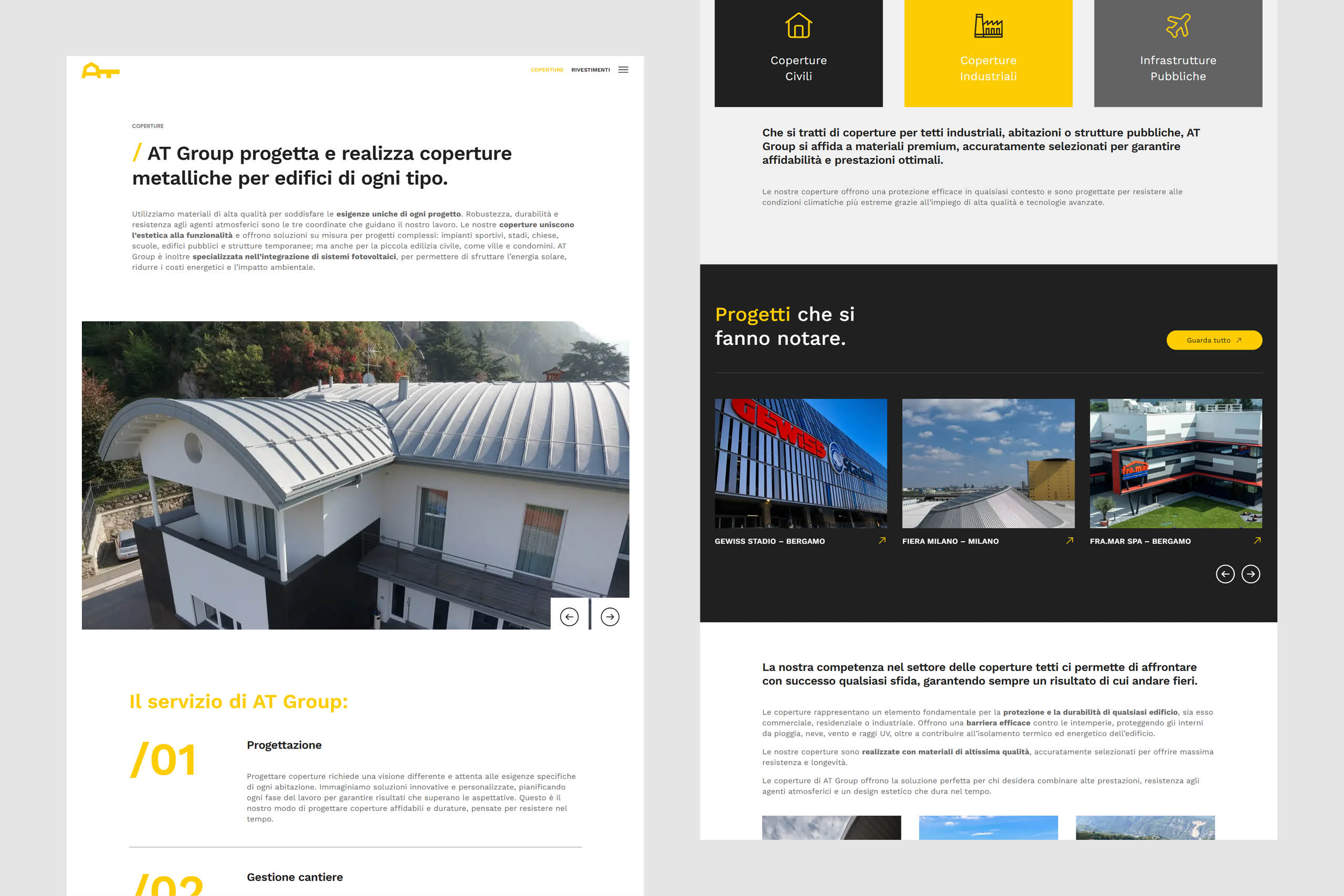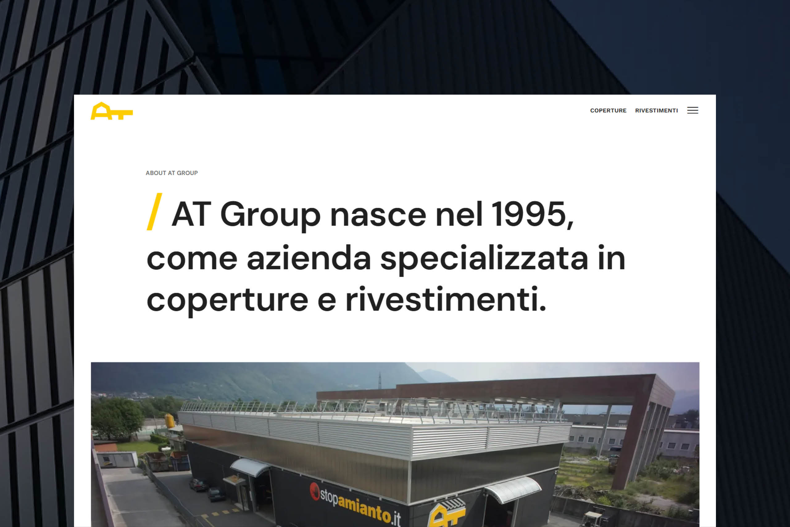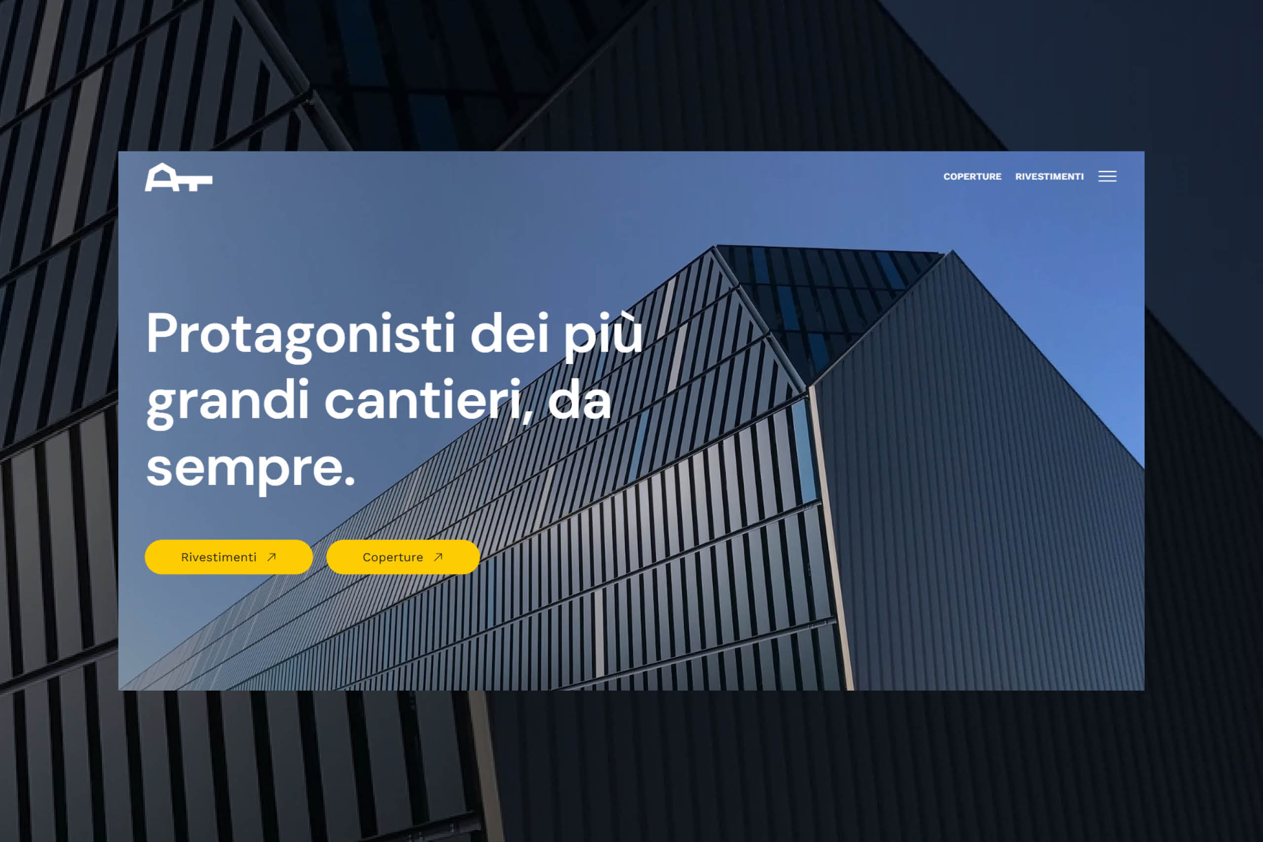 At Group è un’azienda che opera in Italia e nel mondo, specializzata in coperture e rivestimenti metallici. Volevamo che il nuovo sito riflettesse a luce piena la portata dei suoi progetti. Basta dare uno sguardo al portfolio dell’azienda per comprendere immediatamente la professionalità e l’esperienza del Gruppo, che vanta realizzazioni come il gigantesco Gewiss Stadio Bergamo o la bellissima sede di Technogym a Cesena.