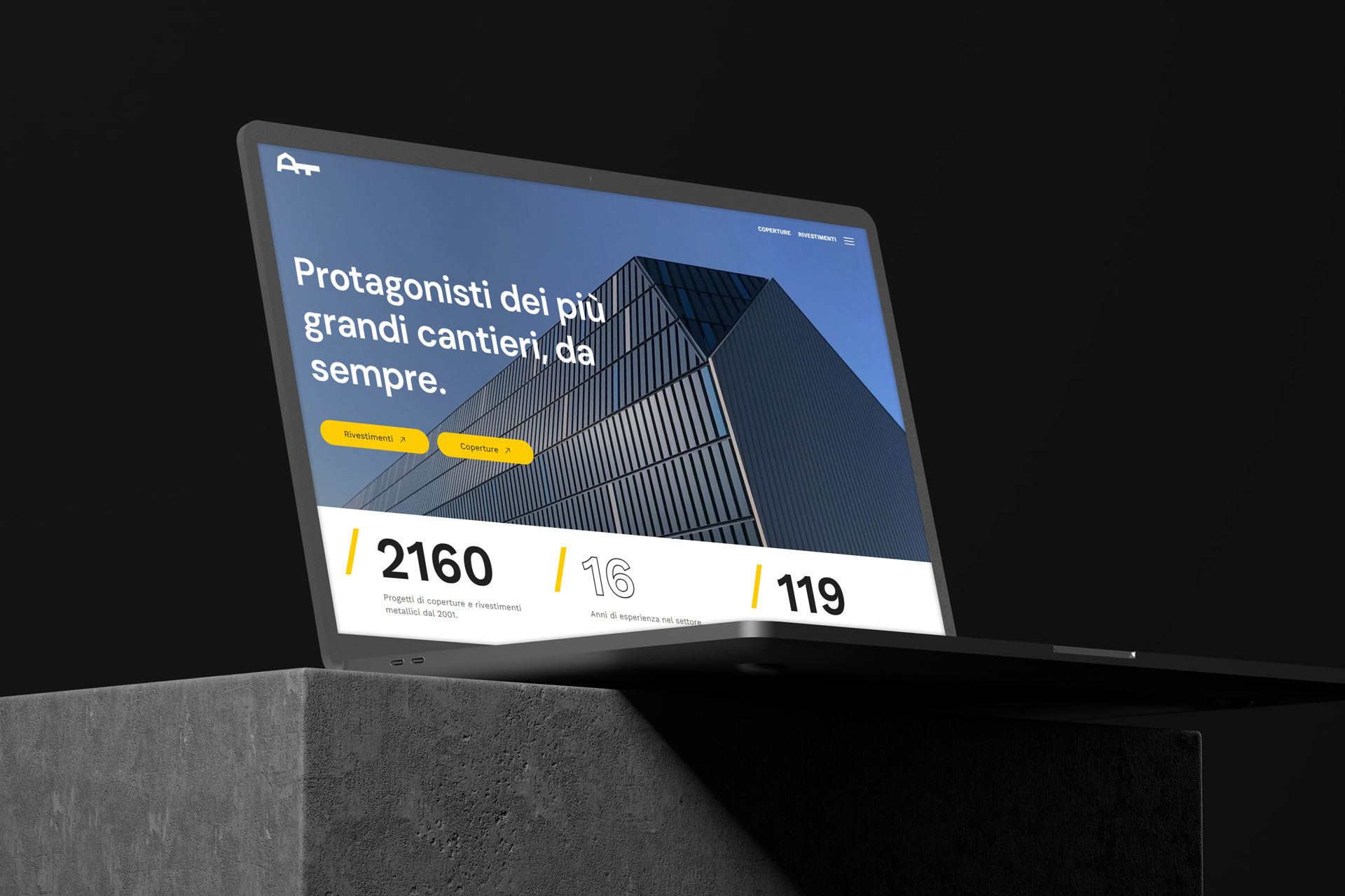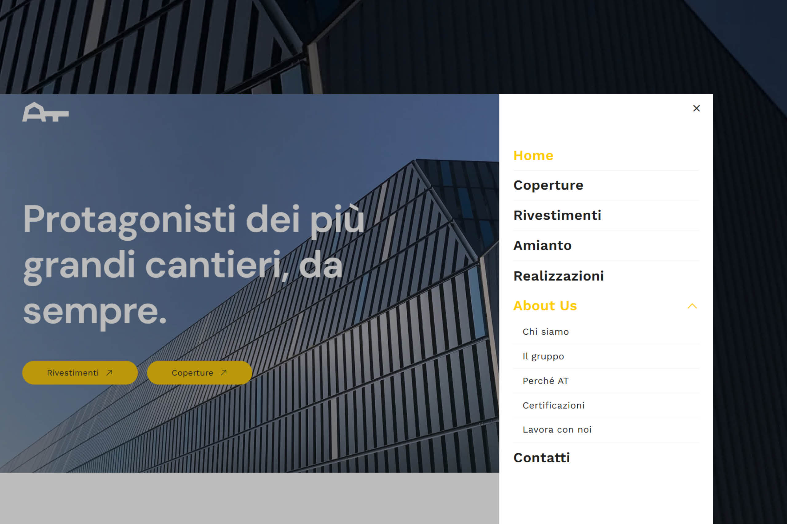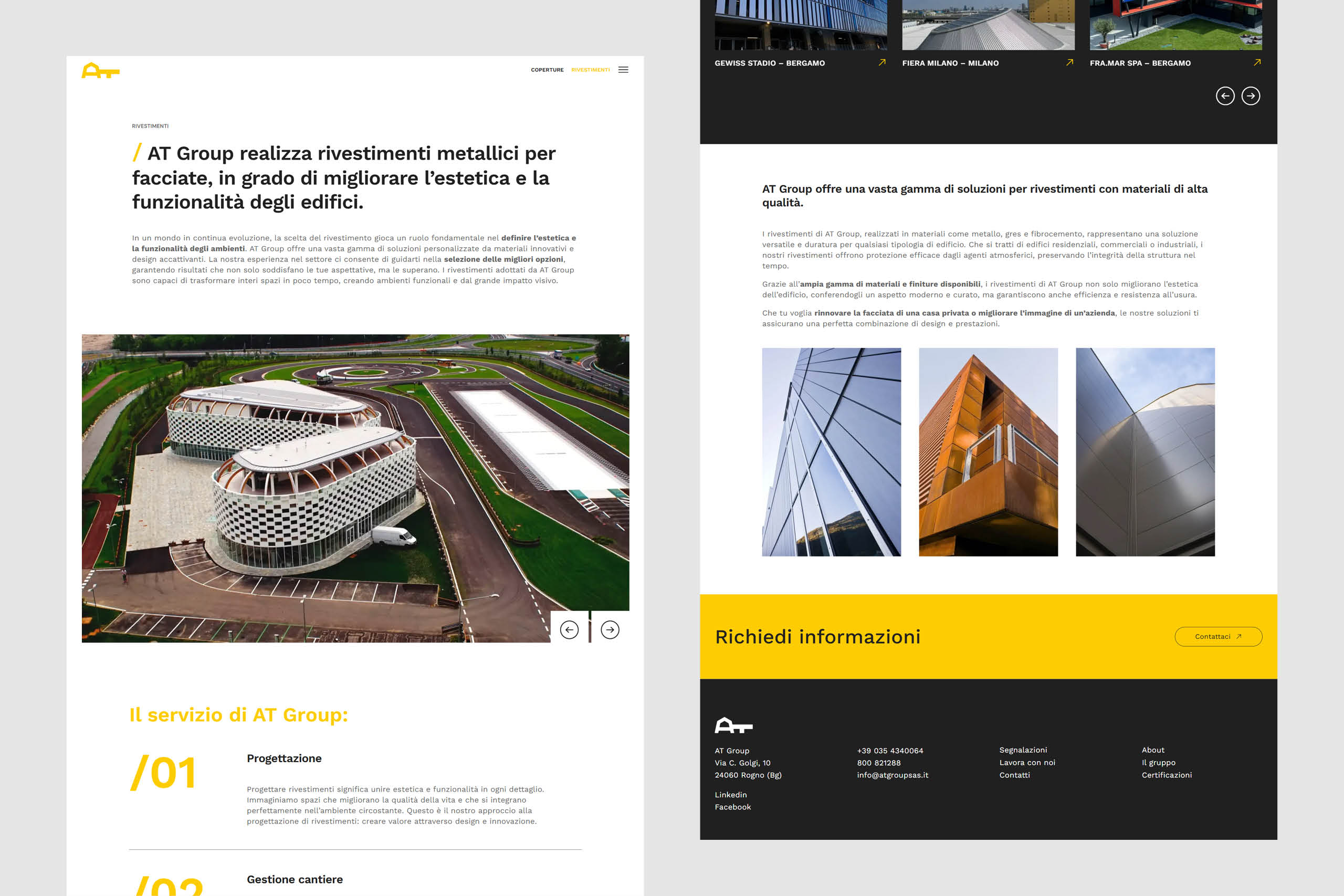 At Group è un’azienda che opera in Italia e nel mondo, specializzata in coperture e rivestimenti metallici. Volevamo che il nuovo sito riflettesse a luce piena la portata dei suoi progetti. Basta dare uno sguardo al portfolio dell’azienda per comprendere immediatamente la professionalità e l’esperienza del Gruppo, che vanta realizzazioni come il gigantesco Gewiss Stadio Bergamo o la bellissima sede di Technogym a Cesena.